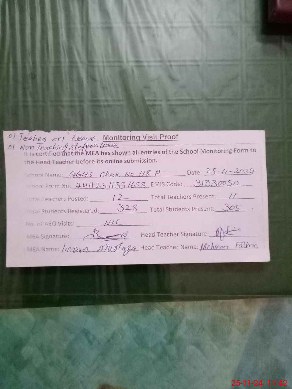 | EMIS Code: 31330050 | Name of School: GGHS CHAK NO. 118/P | |||