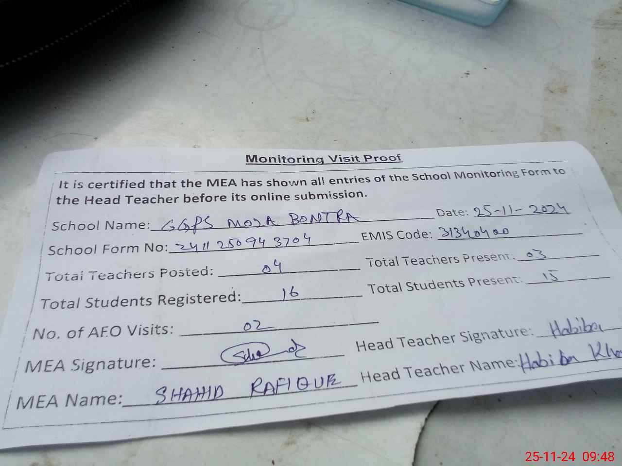 | Attendance Register | Head Teacher | MEA with School | Visit Proof |