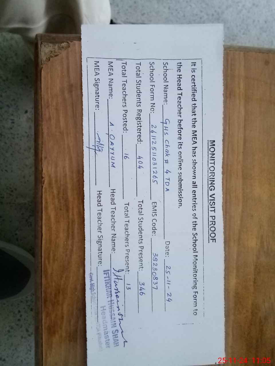 | EMIS Code: 38230837 | Name of School: GHS CHAK NO. 4 TDA | |||