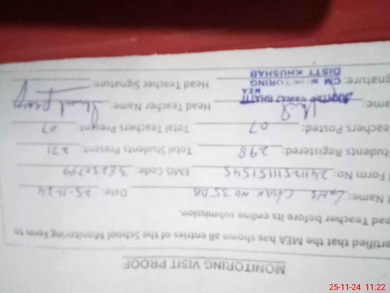 | Attendance Register | Head Teacher | MEA with School | Visit Proof |