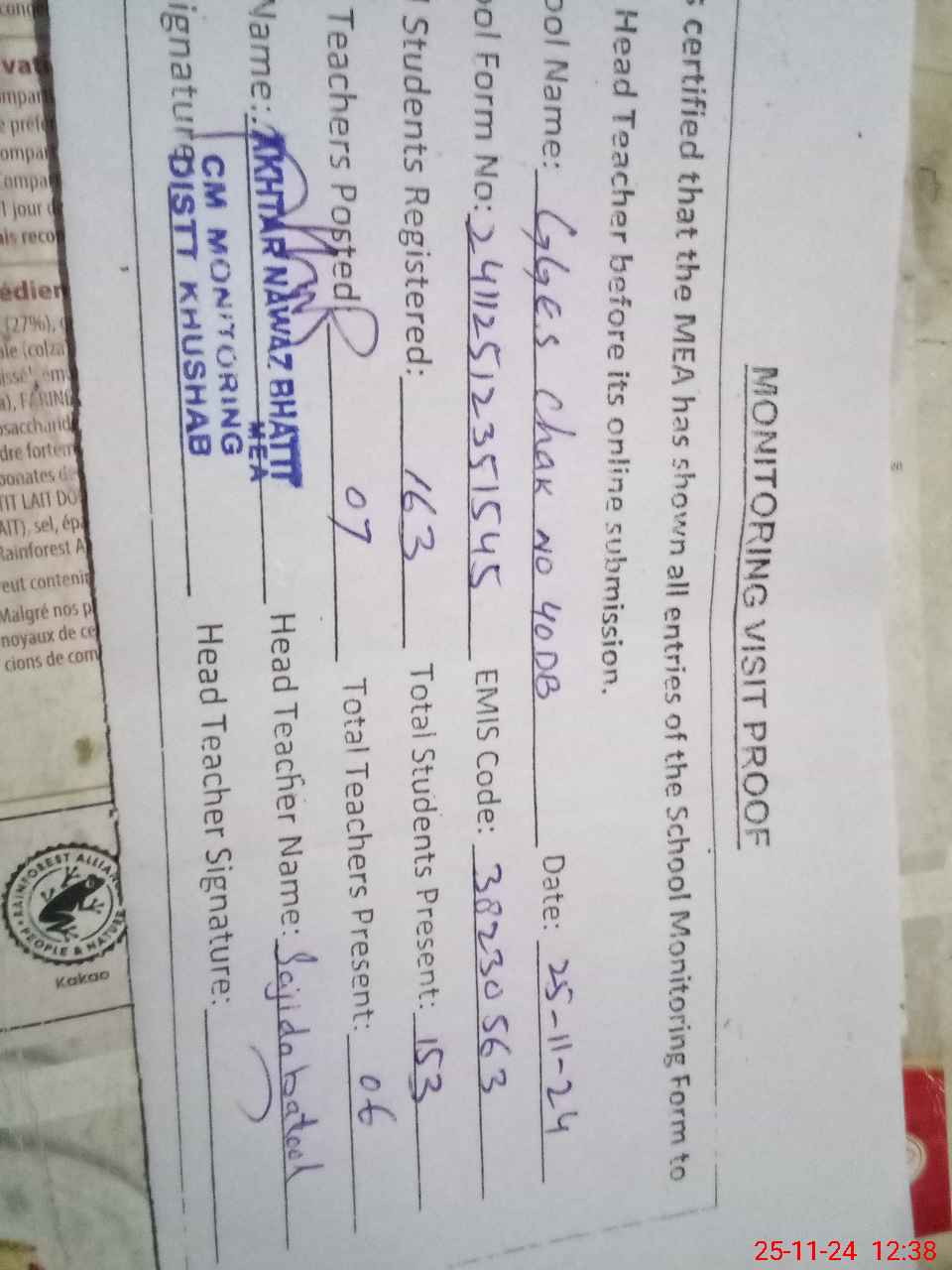 | Attendance Register | Head Teacher | MEA with School | Visit Proof |