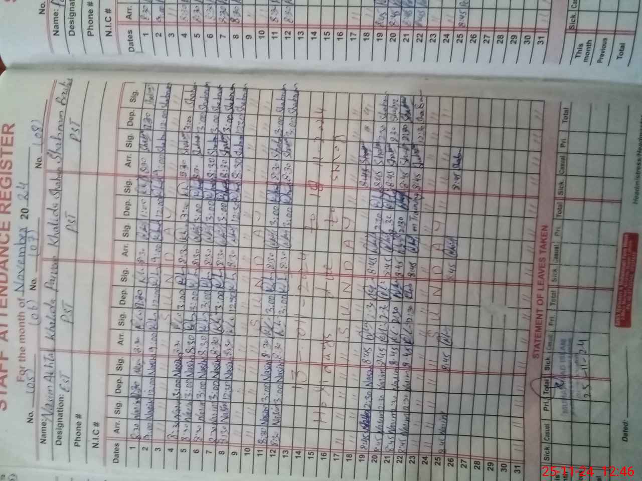 | CNIC | Full Name | Designation | R/C | Absence During Last Calender Month |