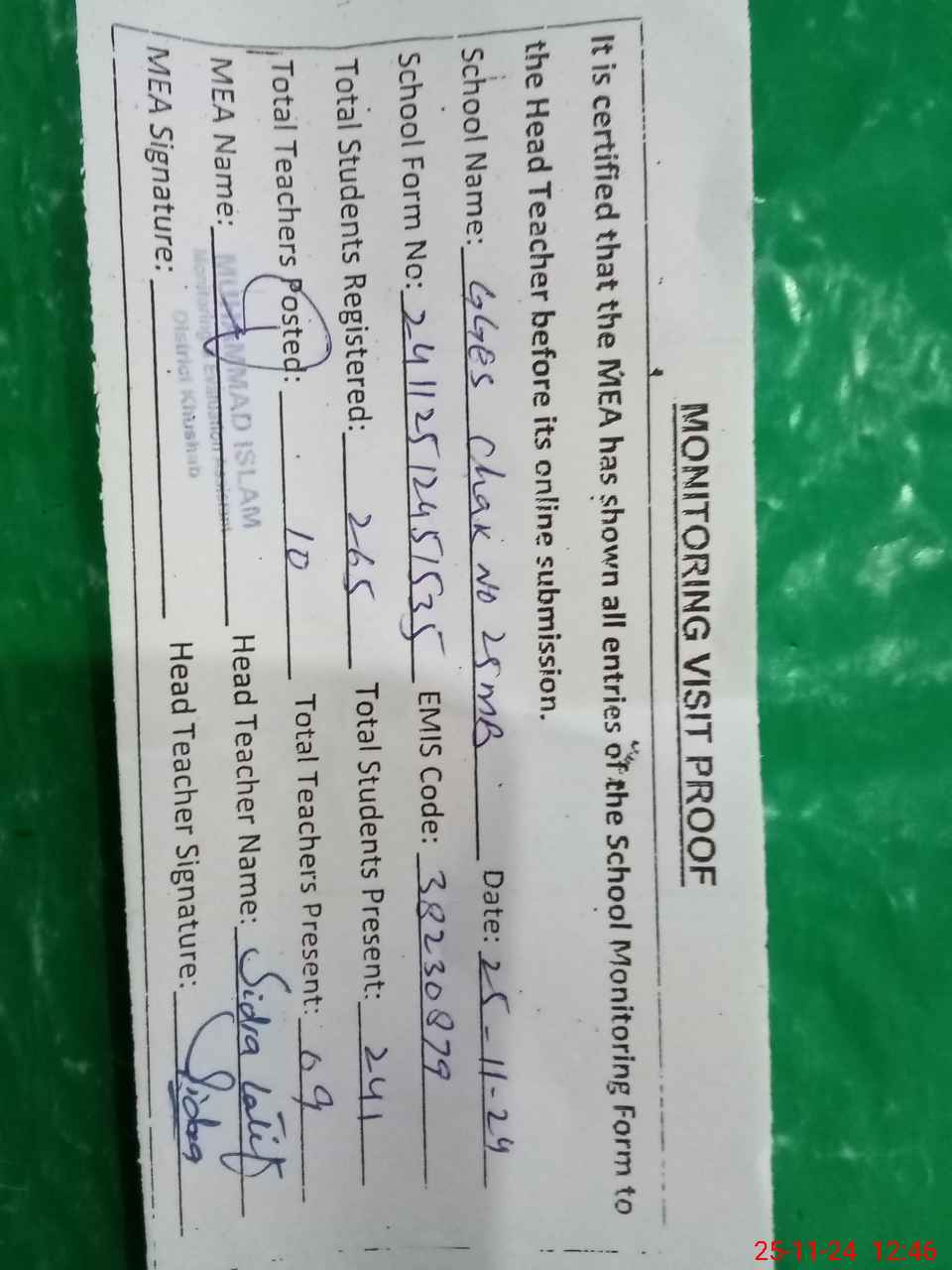| EMIS Code: 38230879 | Name of School: GGES CHAK NO. 25 MB | |||