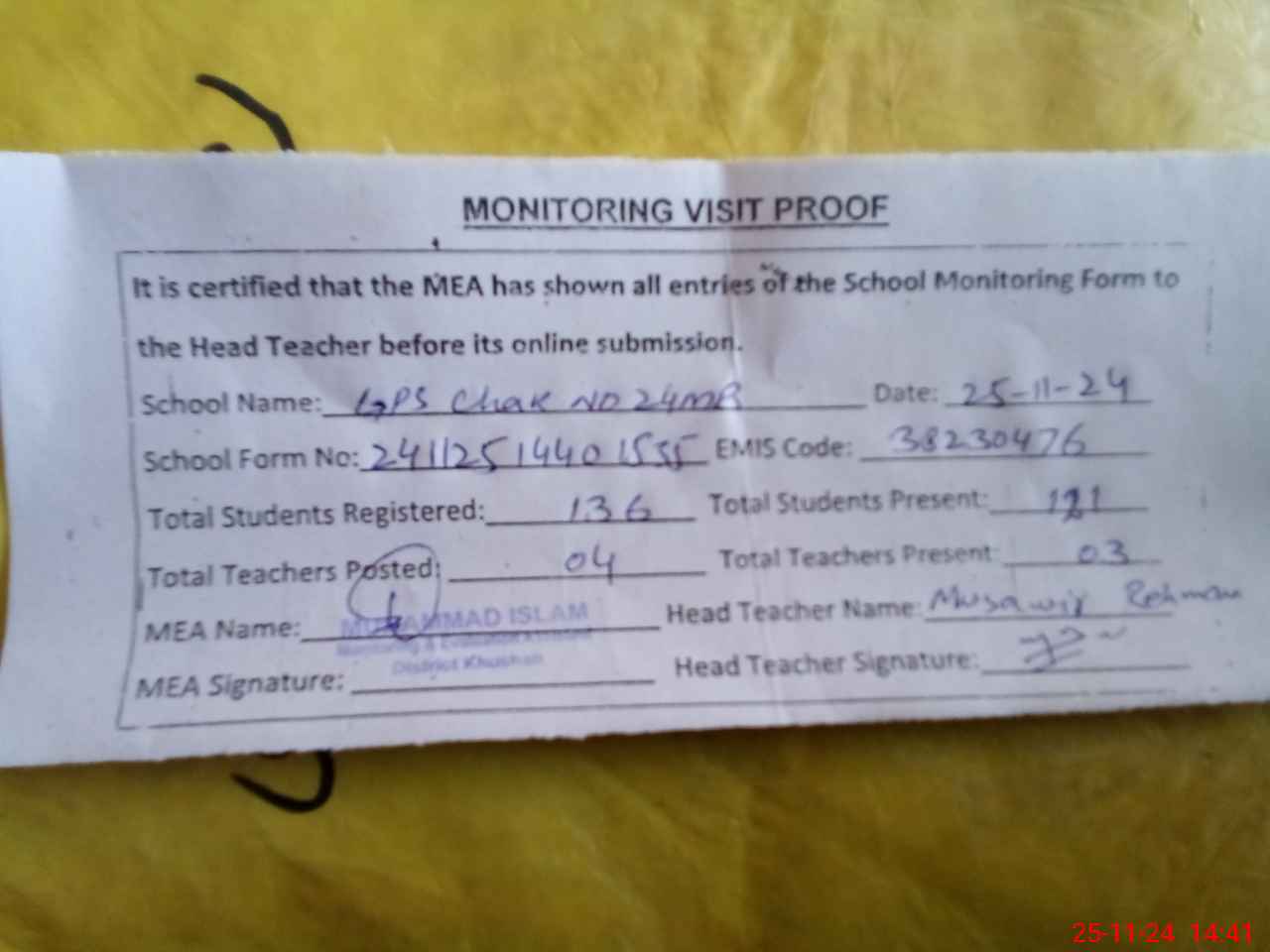 | Attendance Register | Head Teacher | MEA with School | Visit Proof |