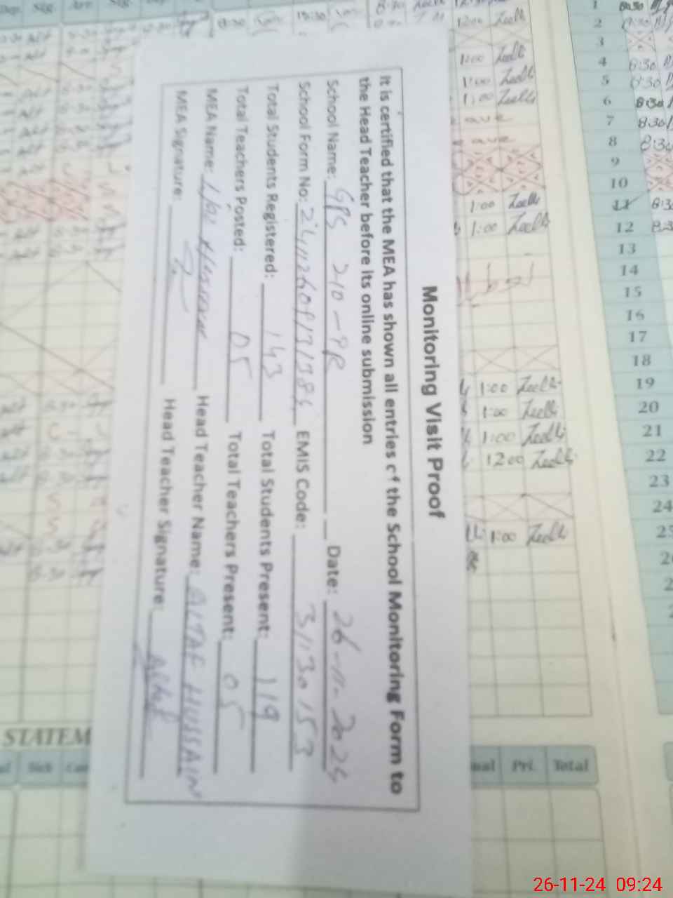 | Attendance Register | Head Teacher | MEA with School | Visit Proof |