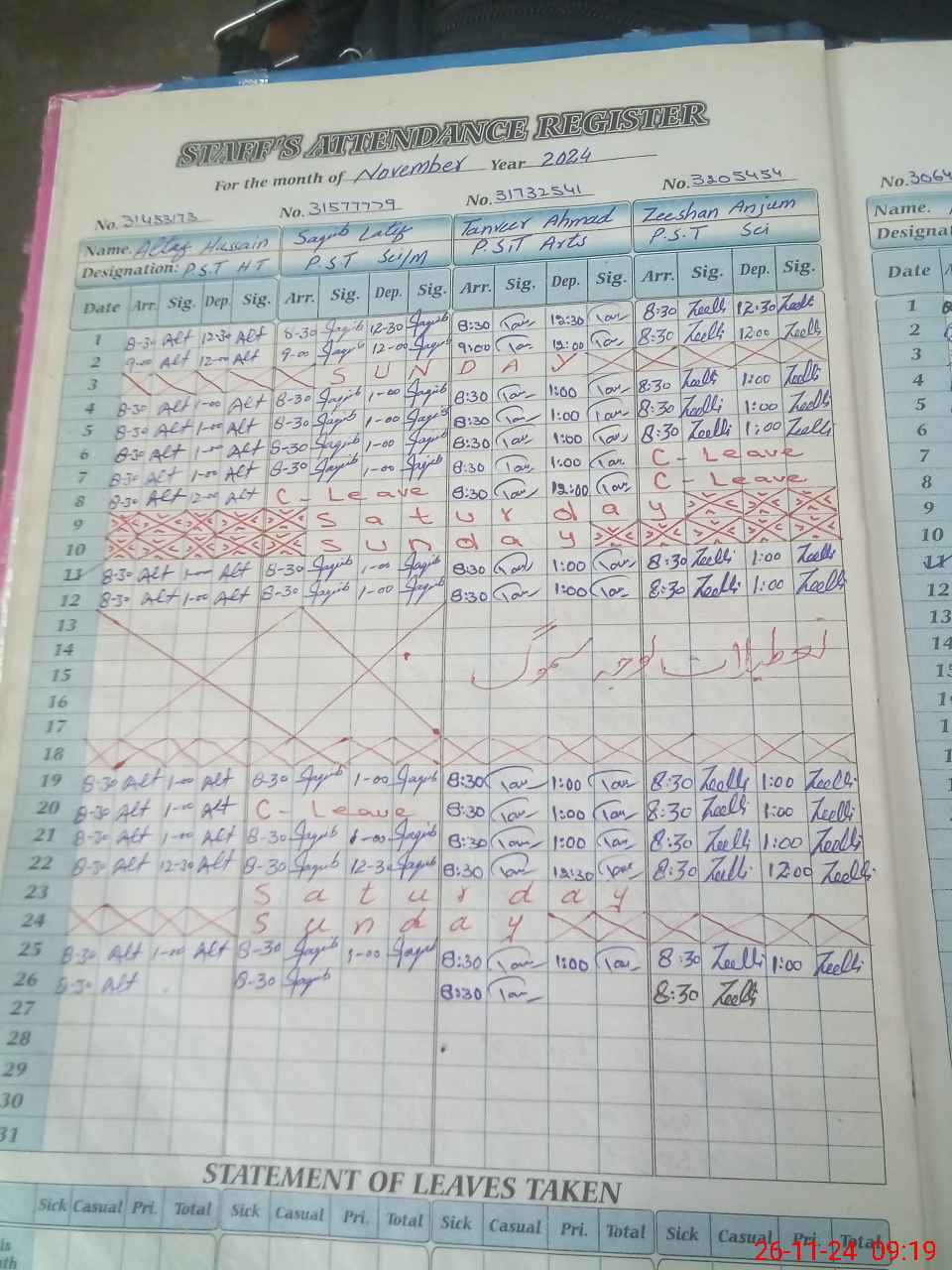 | CNIC | Full Name | Designation | R/C | Absence During Last Calender Month |