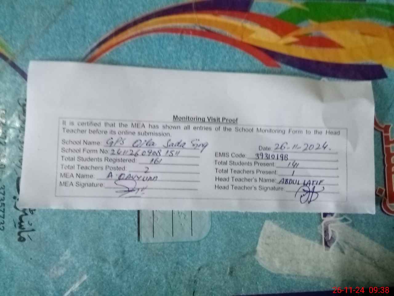 | Attendance Register | Head Teacher | MEA with School | Visit Proof |