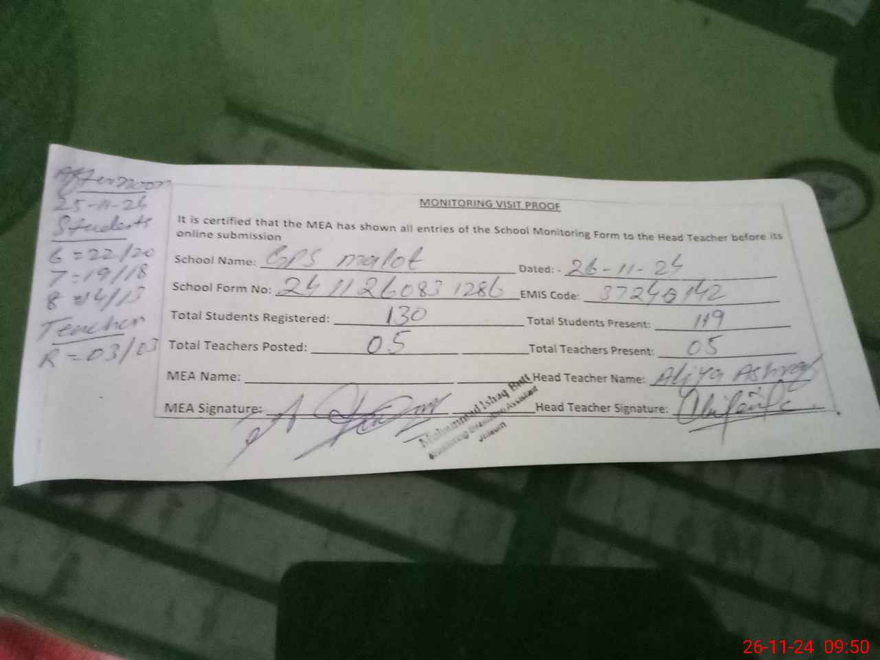 | Attendance Register | Head Teacher | MEA with School | Visit Proof |