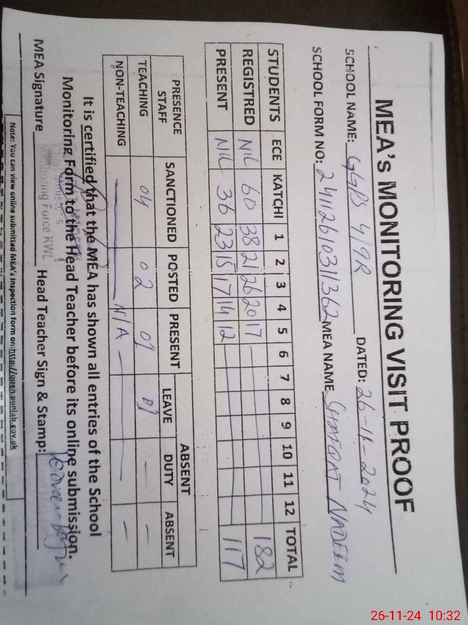 | Attendance Register | Head Teacher | MEA with School | Visit Proof |