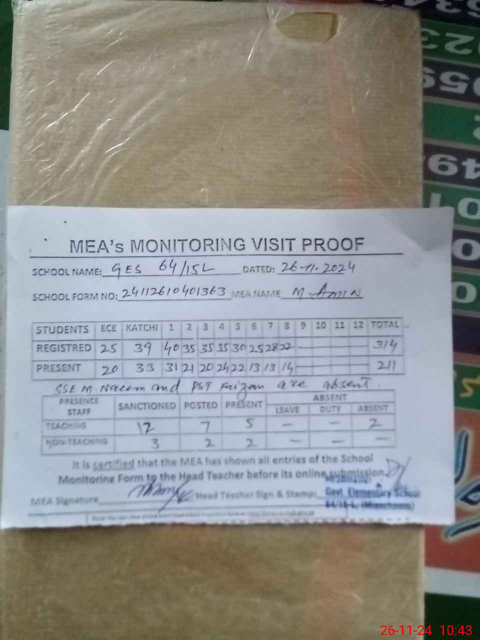 | EMIS Code: 36430059 | Name of School: GES 64/15-L MIAN CHANNU | |||