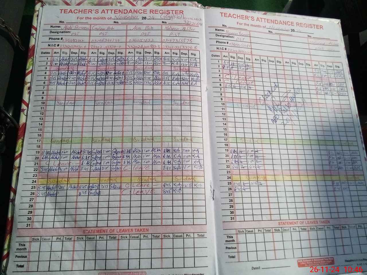 | CNIC | Full Name | Designation | R/C | Absence During Last Calender Month |