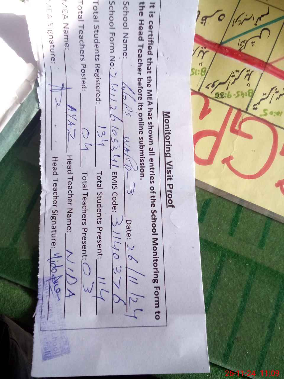 | Attendance Register | Head Teacher | MEA with School | Visit Proof |
