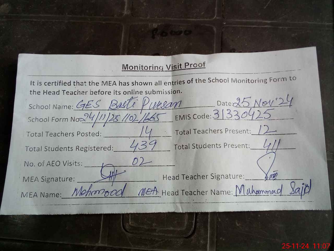 | Monitoring Date: 25-11-2024 | Start Time: 25-11-2024 10:35 AM | End Time: 25-11-2024 11:07 AM | Name of MEA: Ma**** UlHa**** | |