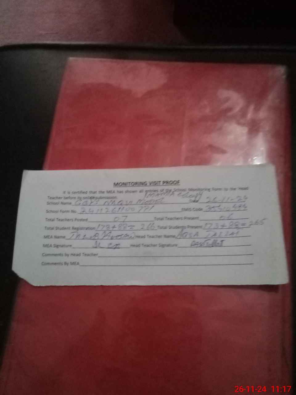 | Attendance Register | Head Teacher | MEA with School | Visit Proof |