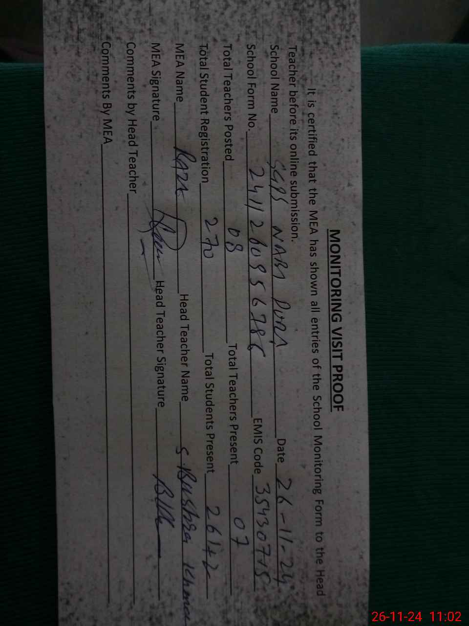 | Attendance Register | Head Teacher | MEA with School | Visit Proof |