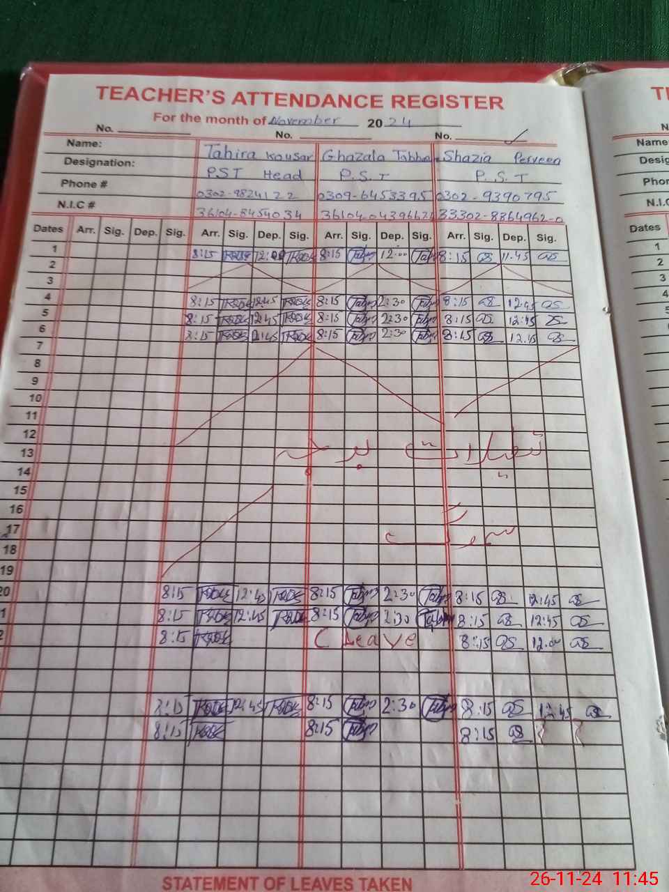 | CNIC | Full Name | Designation | R/C | Absence During Last Calender Month |