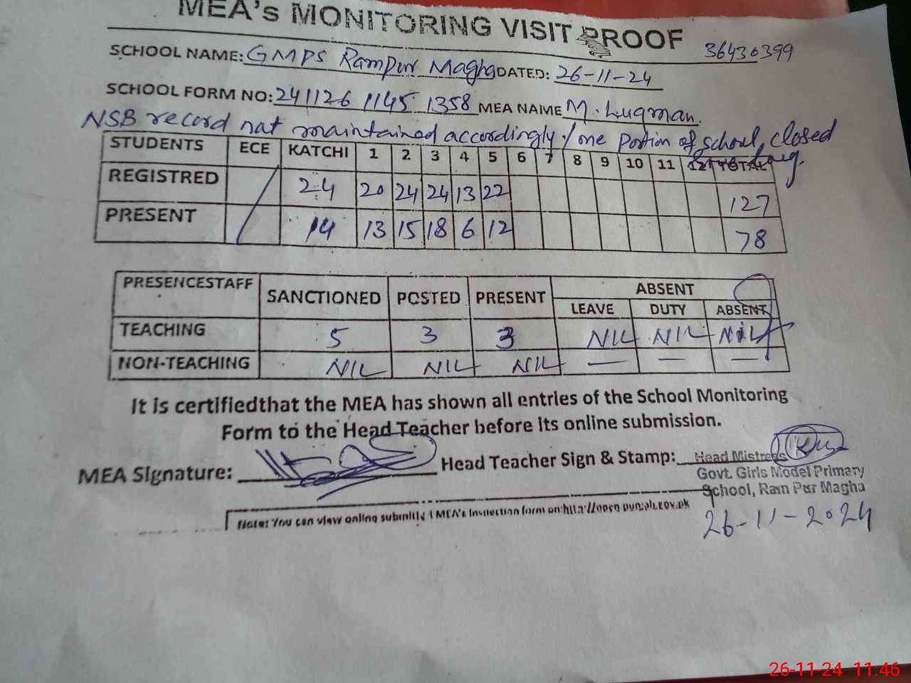 | Attendance Register | Head Teacher | MEA with School | Visit Proof |