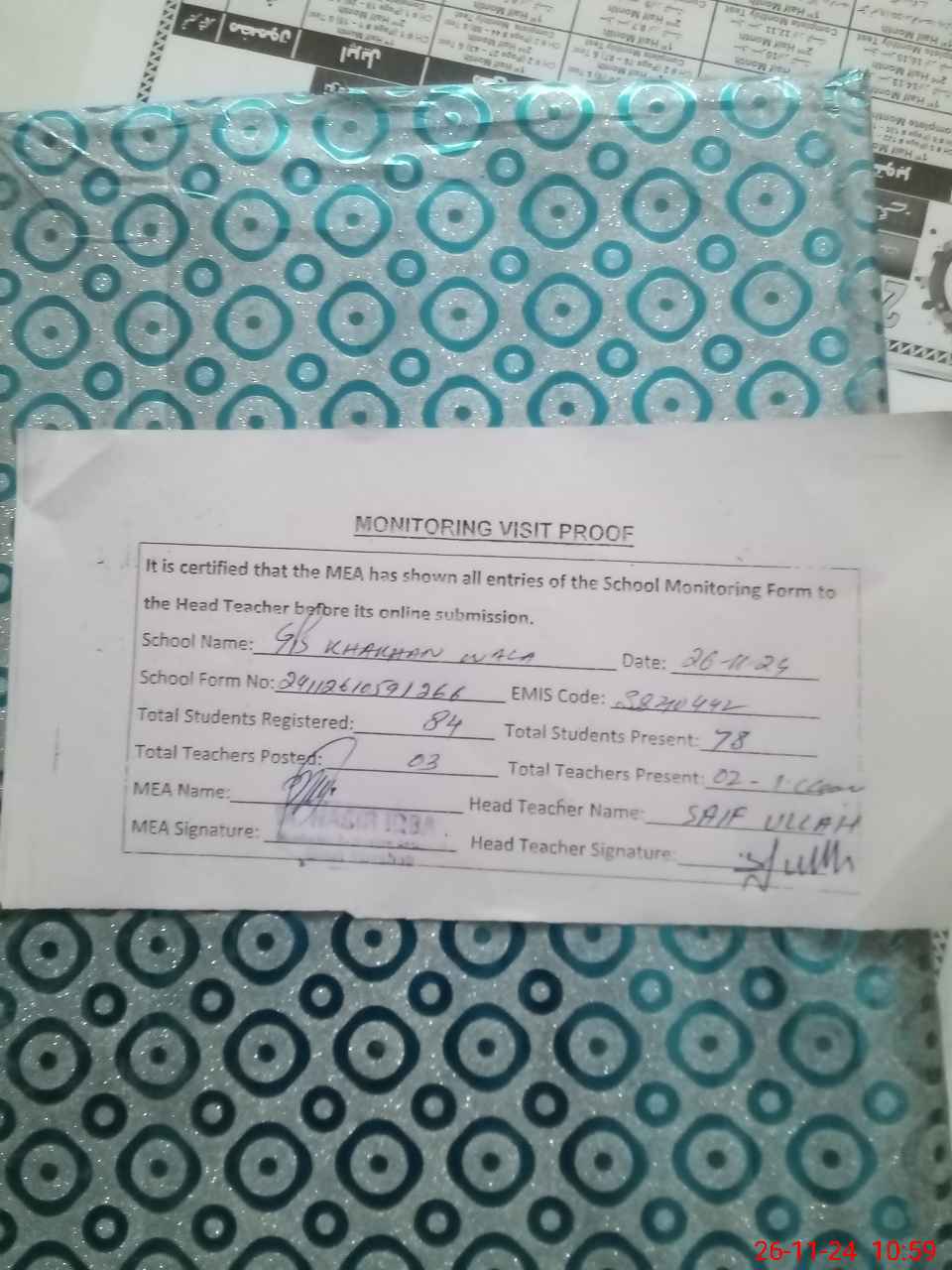 | EMIS Code: 38210442 | Name of School: GPS KHAKHAN WALA | |||