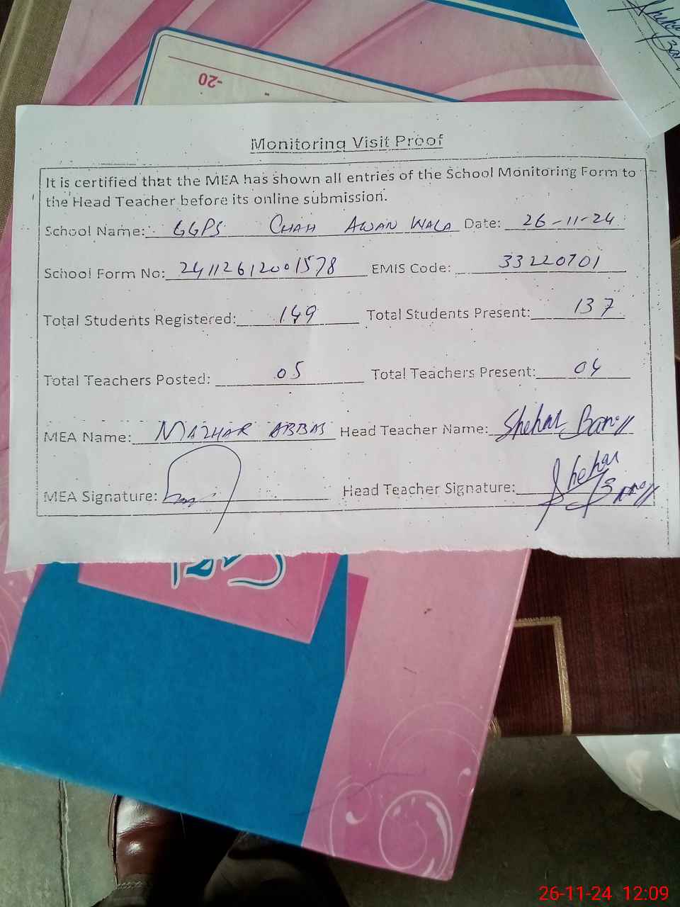| Attendance Register | Head Teacher | MEA with School | Visit Proof |