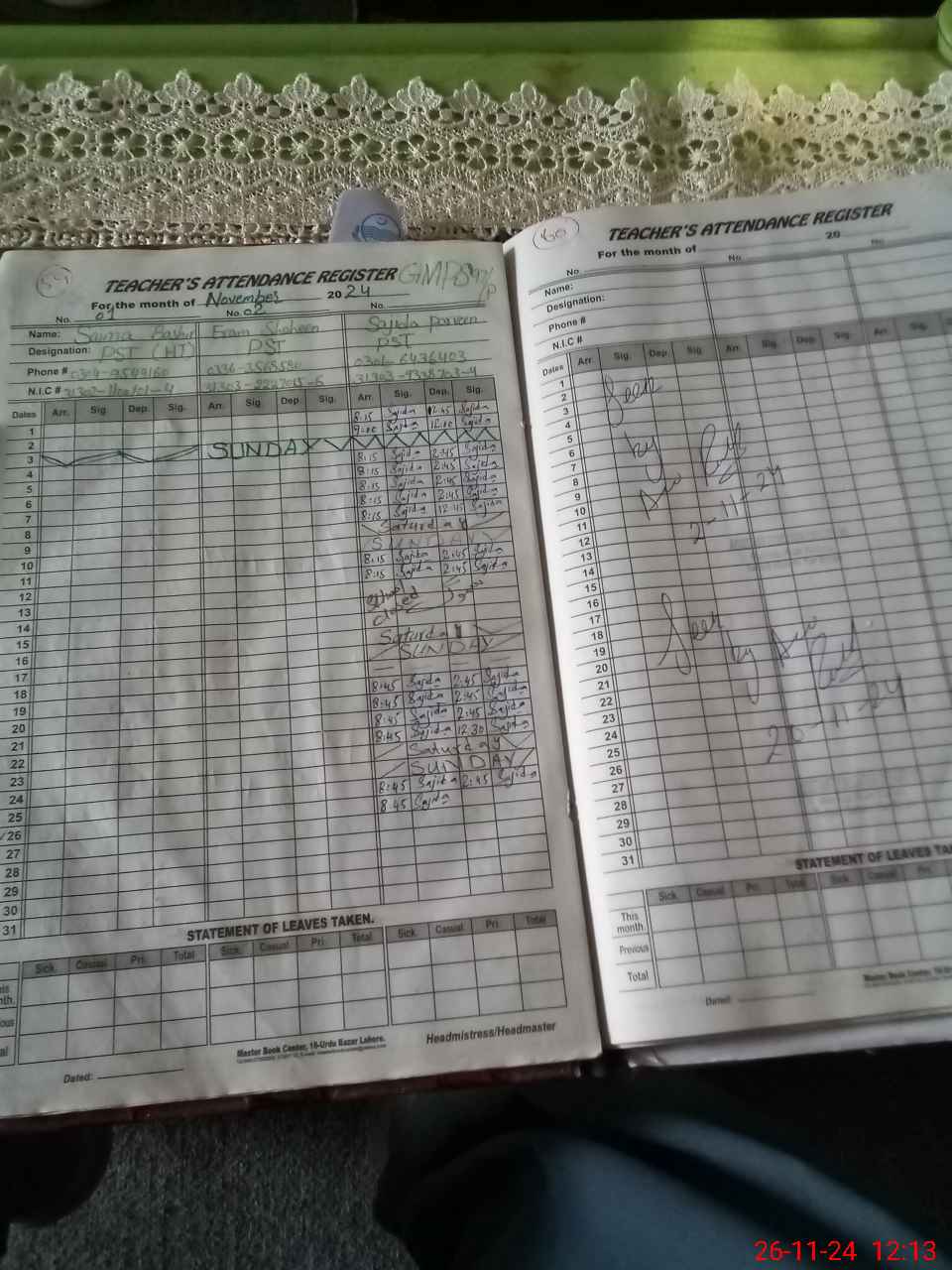 | CNIC | Full Name | Designation | R/C | Absence During Last Calender Month |
