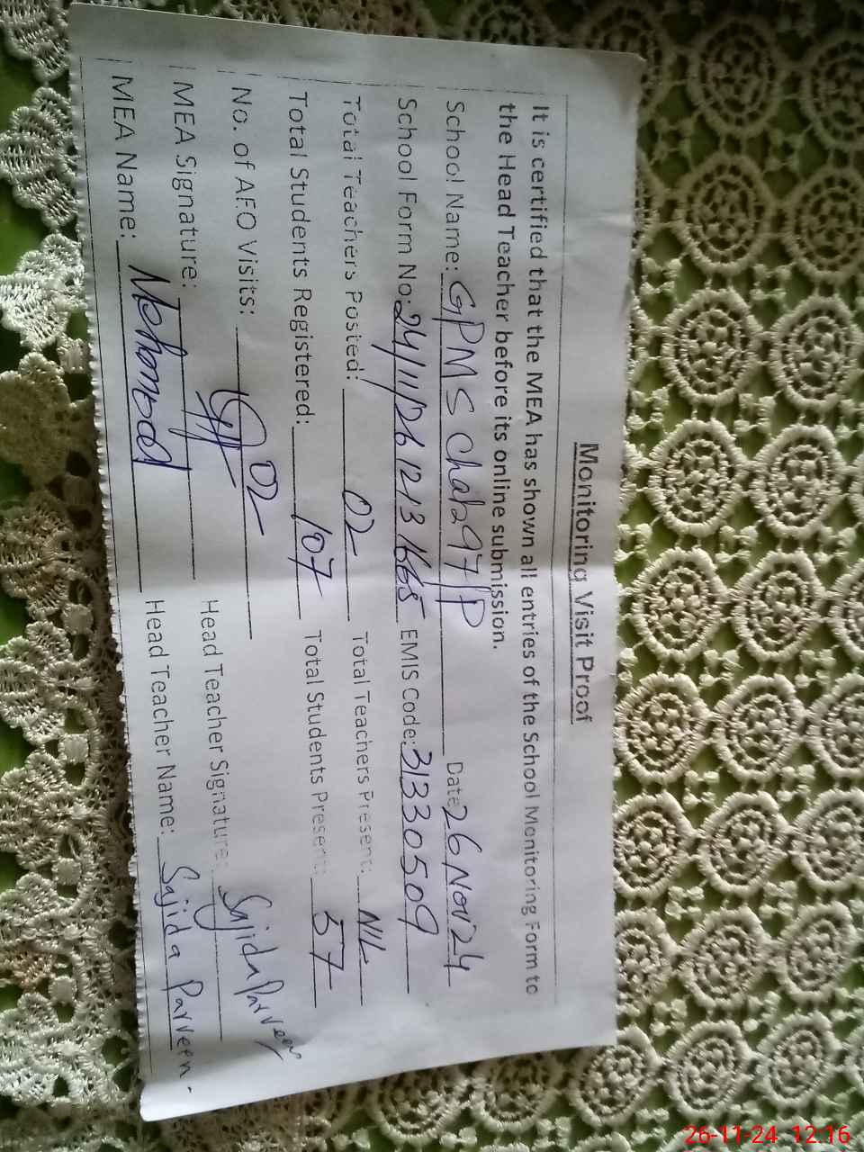| Monitoring Date: 26-11-2024 | Start Time: 26-11-2024 11:54 AM | End Time: 26-11-2024 12:16 PM | Name of MEA: Ma**** UlHa**** | |
