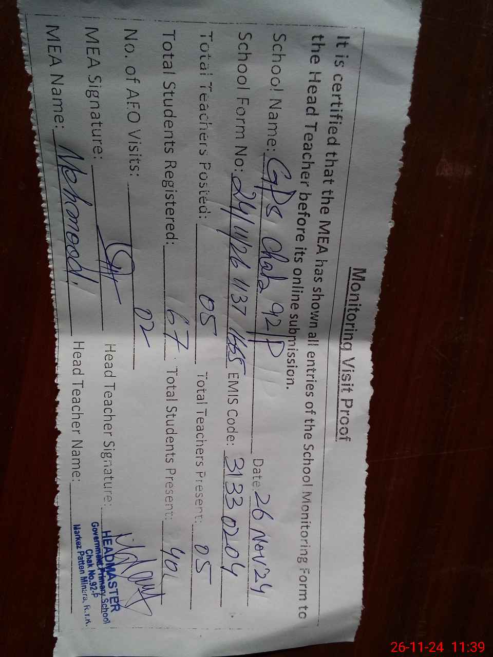 | Attendance Register | Head Teacher | MEA with School | Visit Proof |
