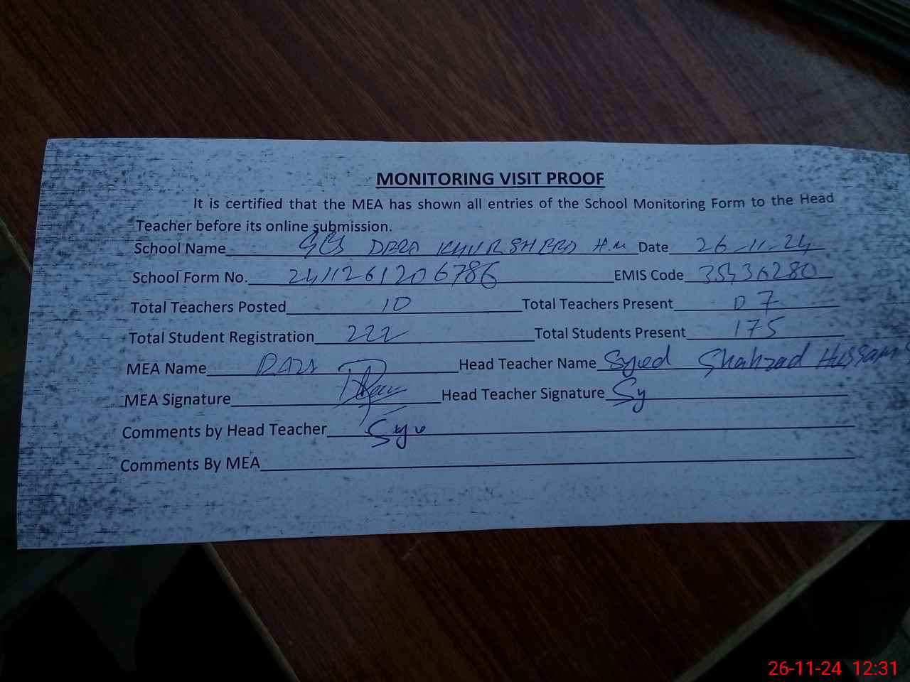 | Attendance Register | Head Teacher | MEA with School | Visit Proof |