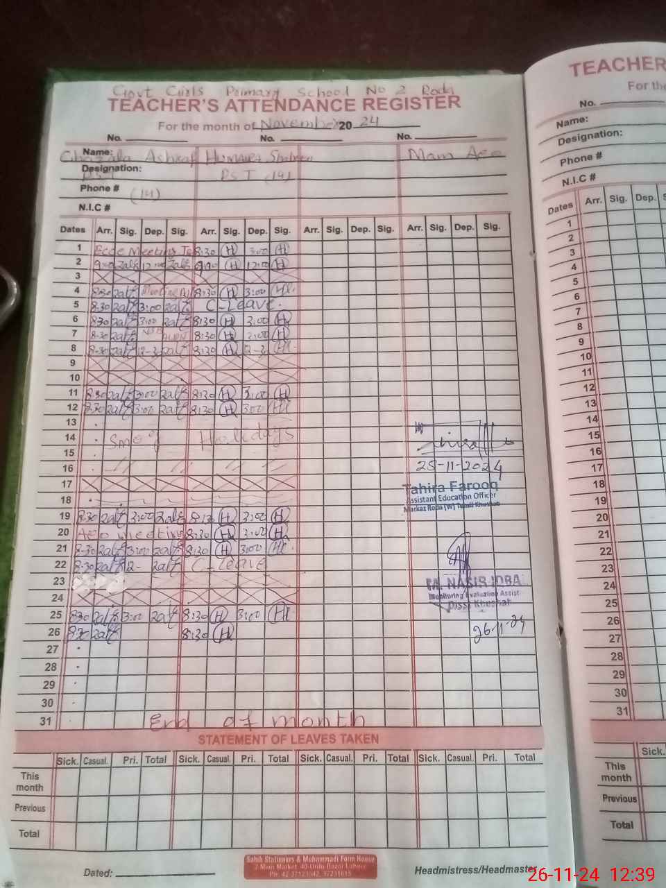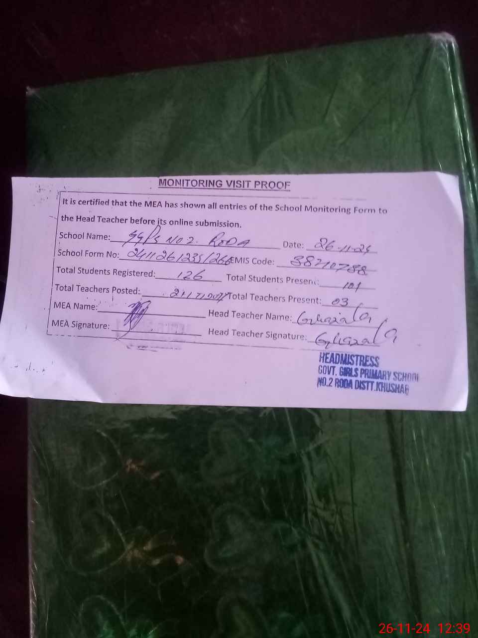 | Attendance Register | Head Teacher | MEA with School | Visit Proof |