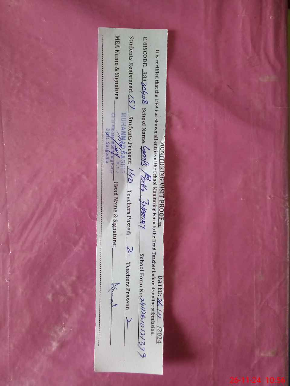 | Attendance Register | Head Teacher | MEA with School | Visit Proof |