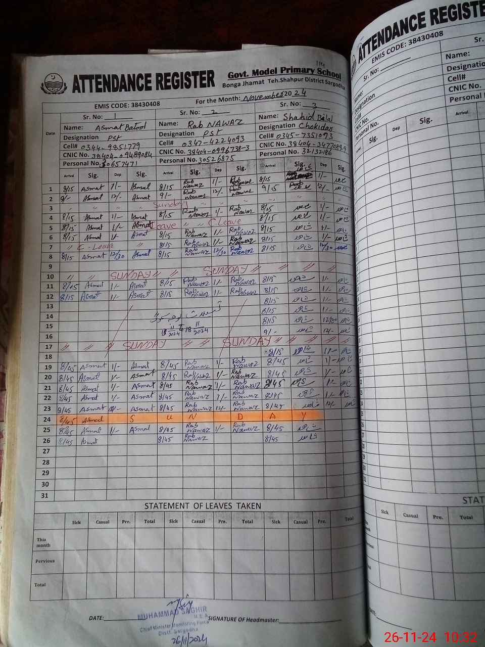 | CNIC | Full Name | Designation | R/C | Absence During Last Calender Month |