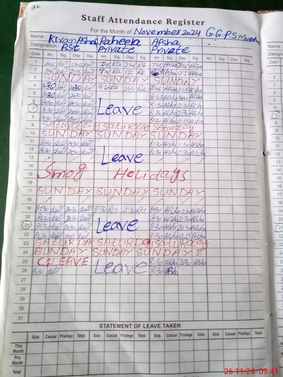 | Leave | Duty | Absent | Maternity | Medical | Ex- Pak |