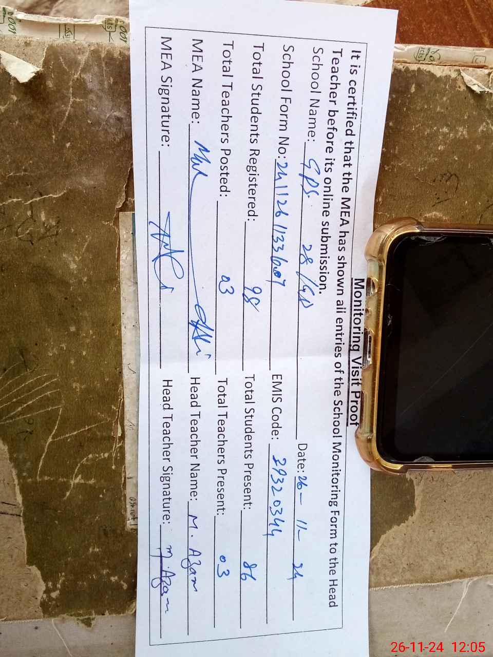 | Attendance Register | Head Teacher | MEA with School | Visit Proof |