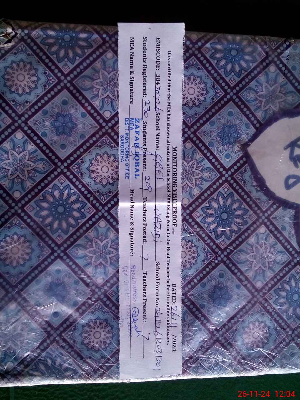 | Certified that this School was Inspected by the Undersigned MEA/DMO Today and the Information Stated Above is as Per Record. | |||||