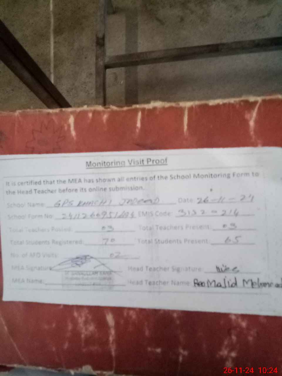 | Monitoring Date: 26-11-2024 | Start Time: 26-11-2024 09:51 AM | End Time: 26-11-2024 10:25 AM | Name of MEA: Mu**** Sa**** Ul**** Sa**** | |