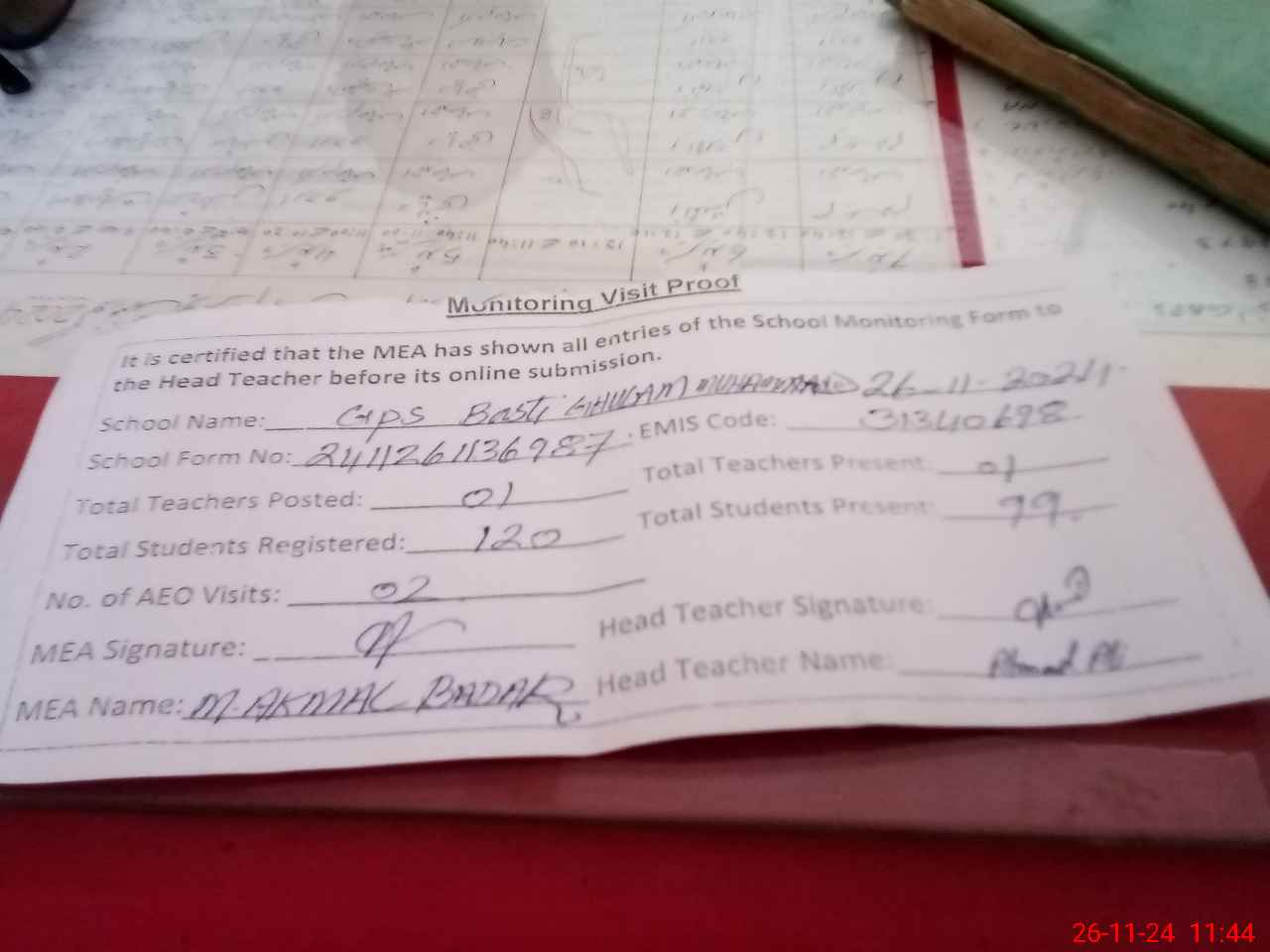 | Attendance Register | Head Teacher | MEA with School | Visit Proof |