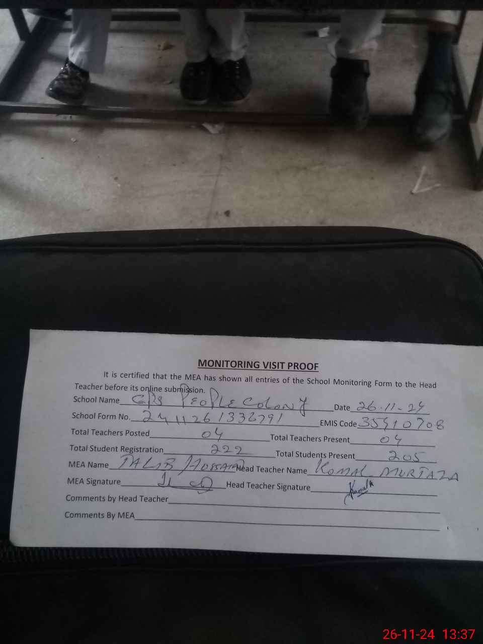 | Attendance Register | Head Teacher | MEA with School | Visit Proof |