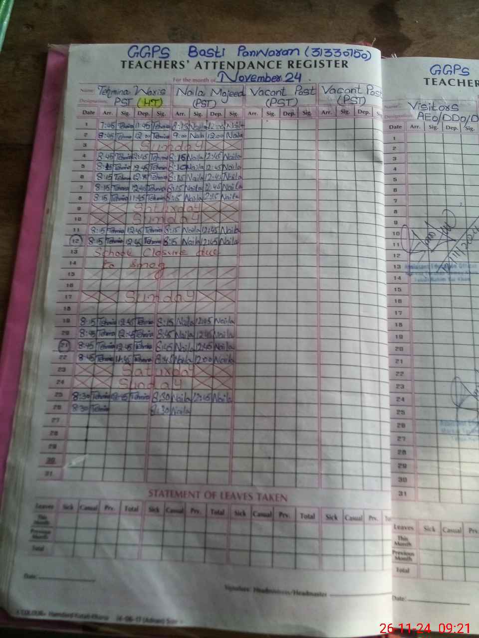 | Remarks (Use Separate Page if Required): Class verification is not updated on mea tab as per sis and school has insaf afternoon classes with students strength 35 and teachers attendance not updated on 26 11 2024 | |||||