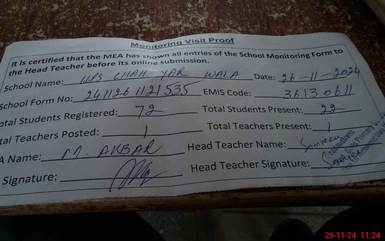 | EMIS Code: 36130611 | Name of School: GGPS CHAH YAR WALA | |||