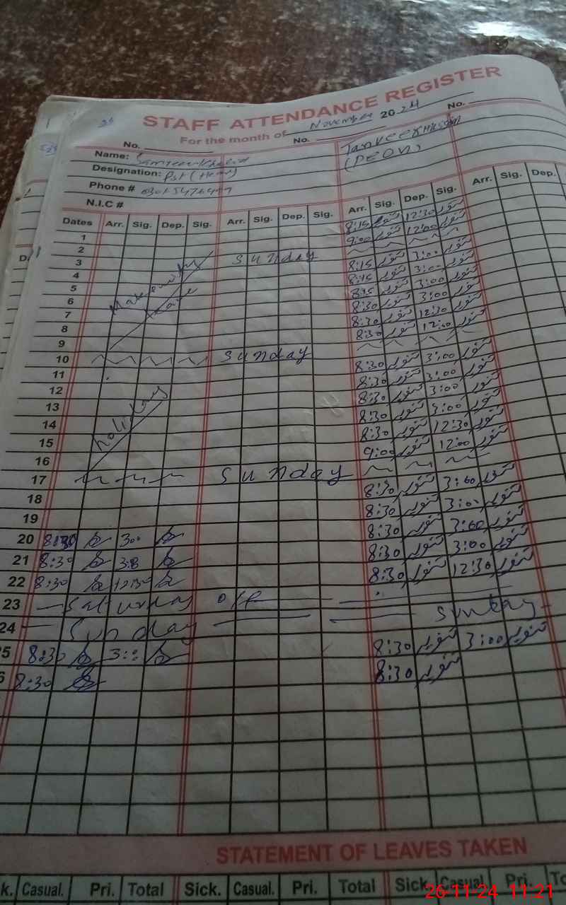 | CNIC | Full Name | Designation | R/C | Absence During Last Calender Month |