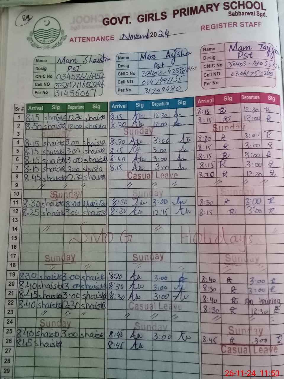 | CNIC | Full Name | Designation | R/C | Absence During Last Calender Month |