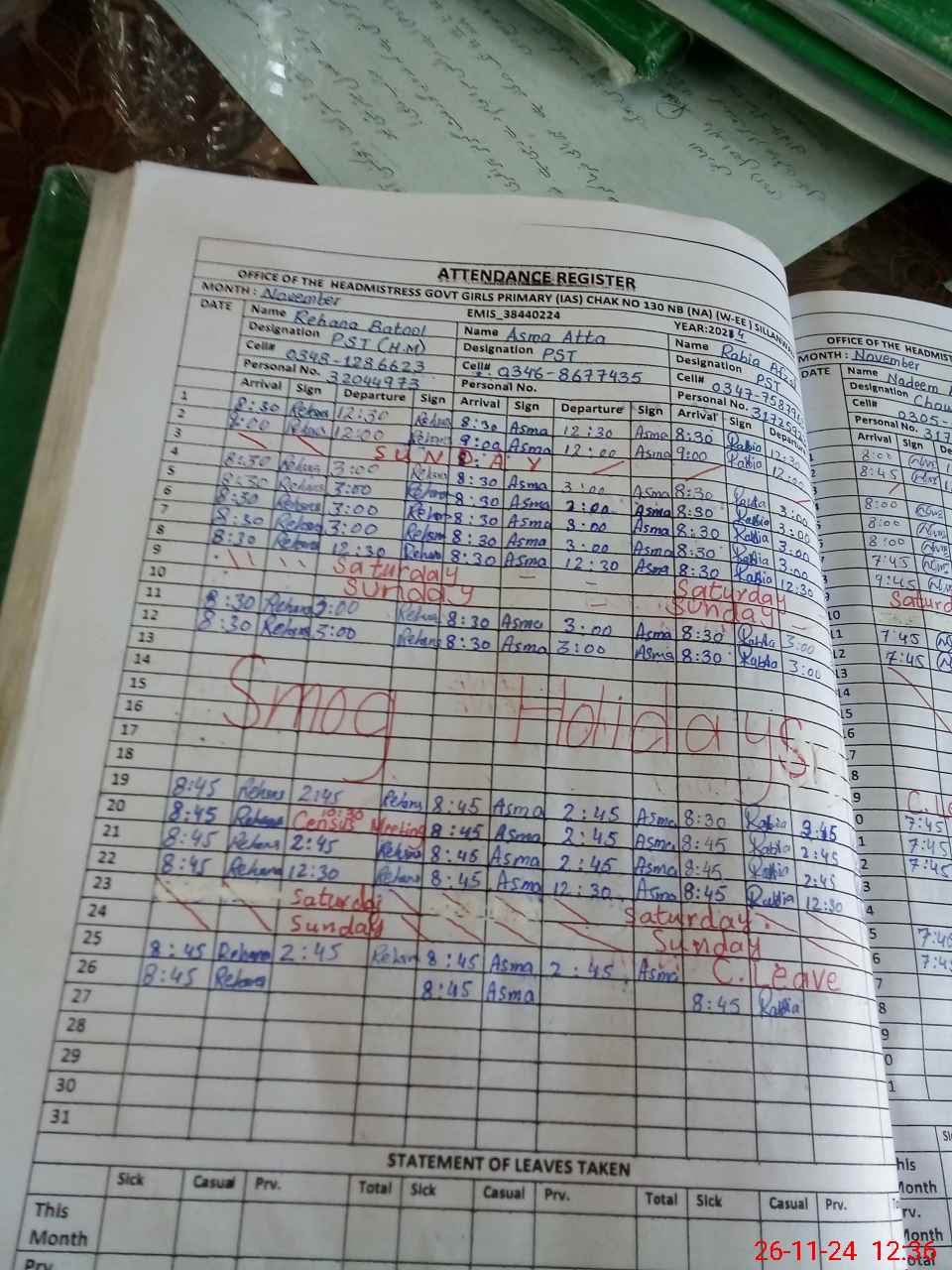 | Leave | Duty | Absent | Maternity | Medical | Ex- Pak |