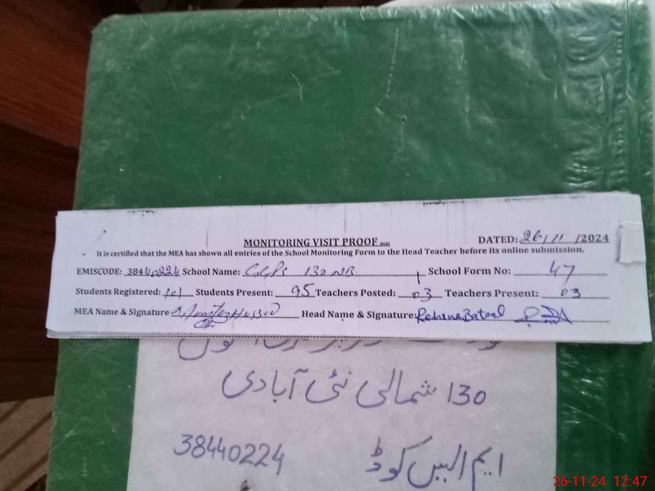 | Attendance Register | Head Teacher | MEA with School | Visit Proof |