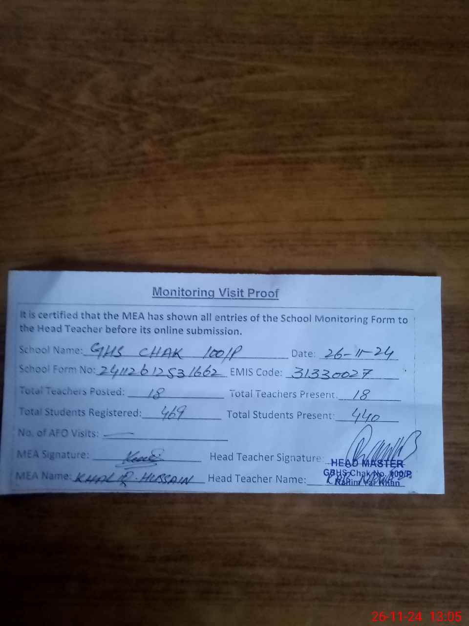 | EMIS Code: 31330027 | Name of School: GHS CHAK NO. 100/P | |||