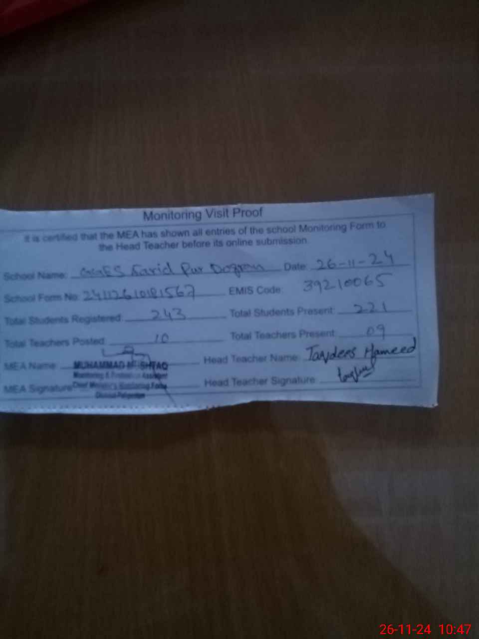 | Attendance Register | Head Teacher | MEA with School | Visit Proof |