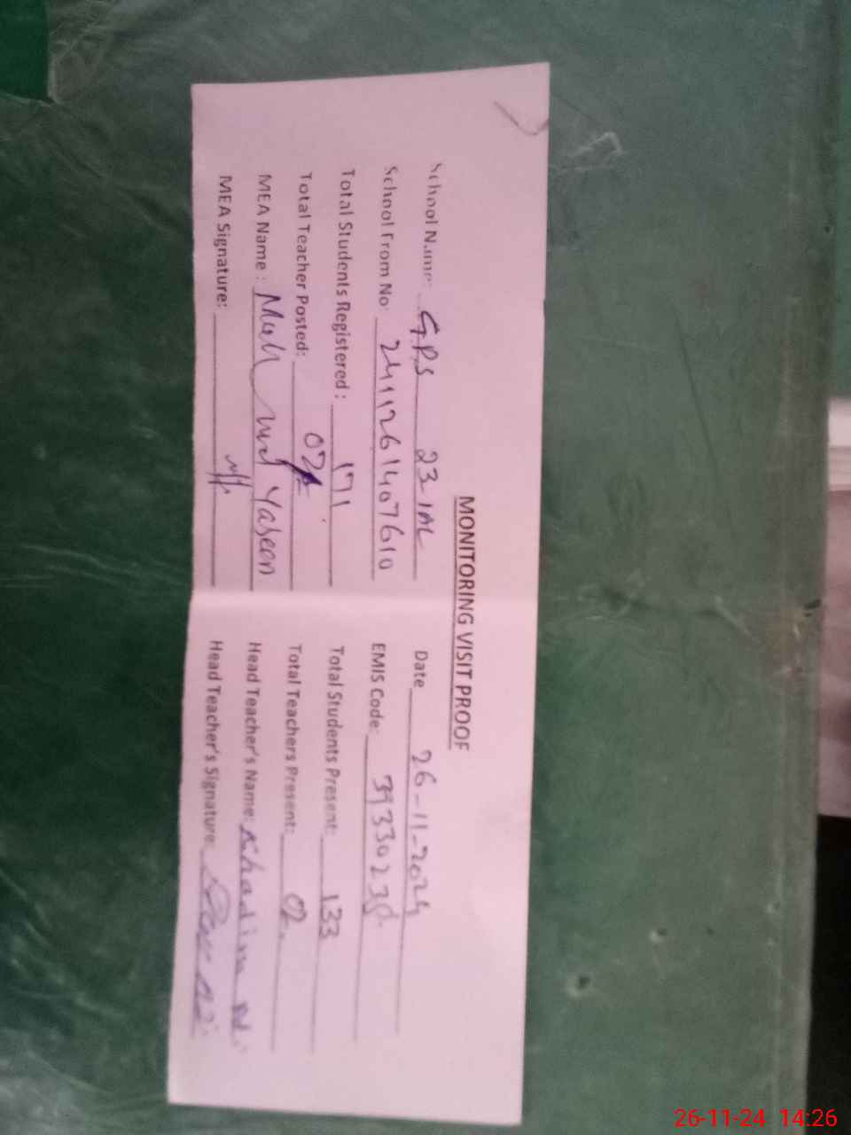 | Attendance Register | Head Teacher | MEA with School | Visit Proof |