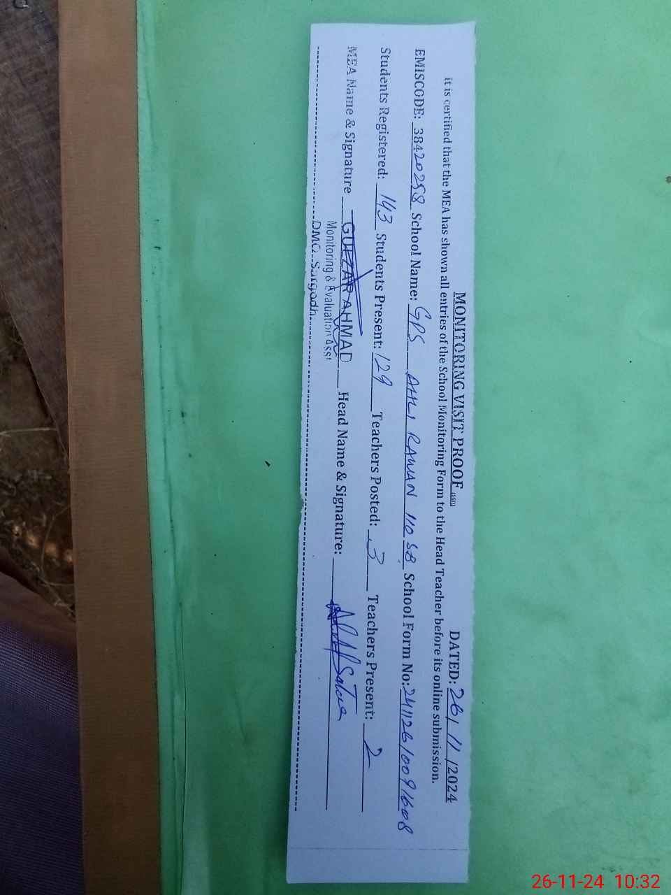 | Attendance Register | Head Teacher | MEA with School | Visit Proof |