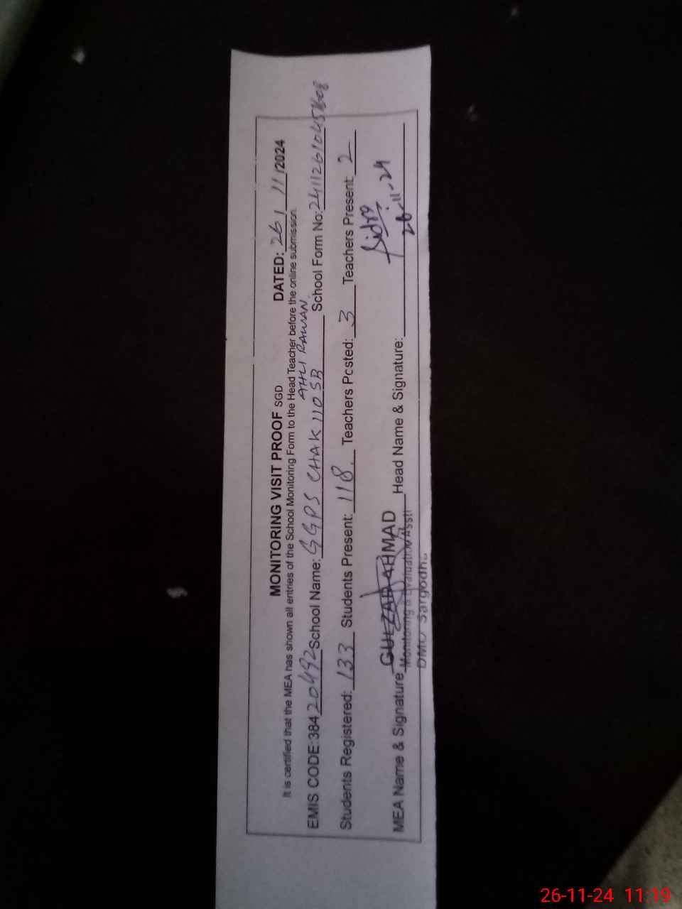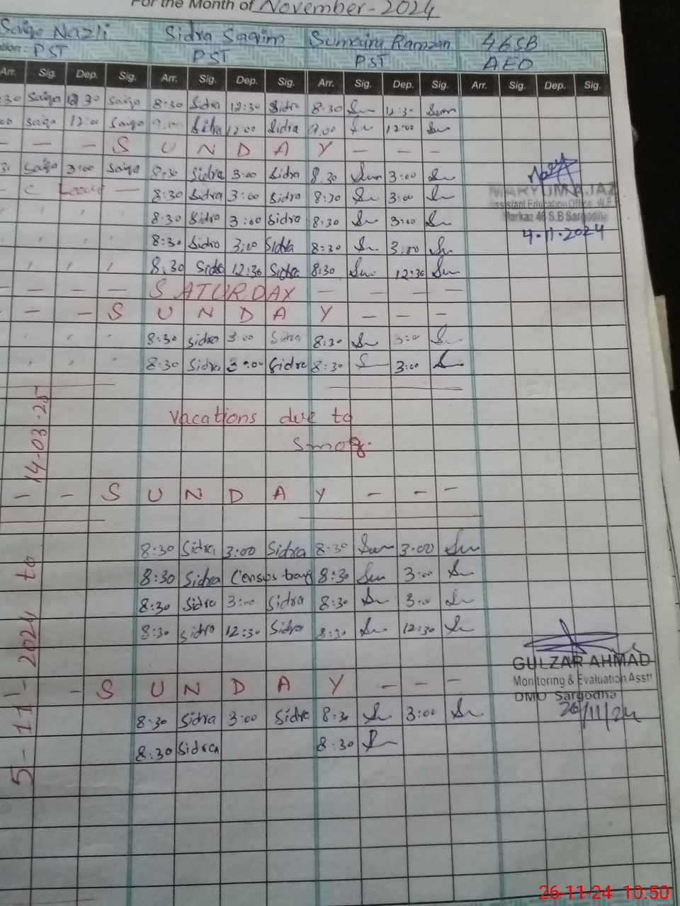 | Monitoring Date: 26-11-2024 | Start Time: 26-11-2024 10:45 AM | End Time: 26-11-2024 11:29 AM | Name of MEA: GU**** AH**** | |