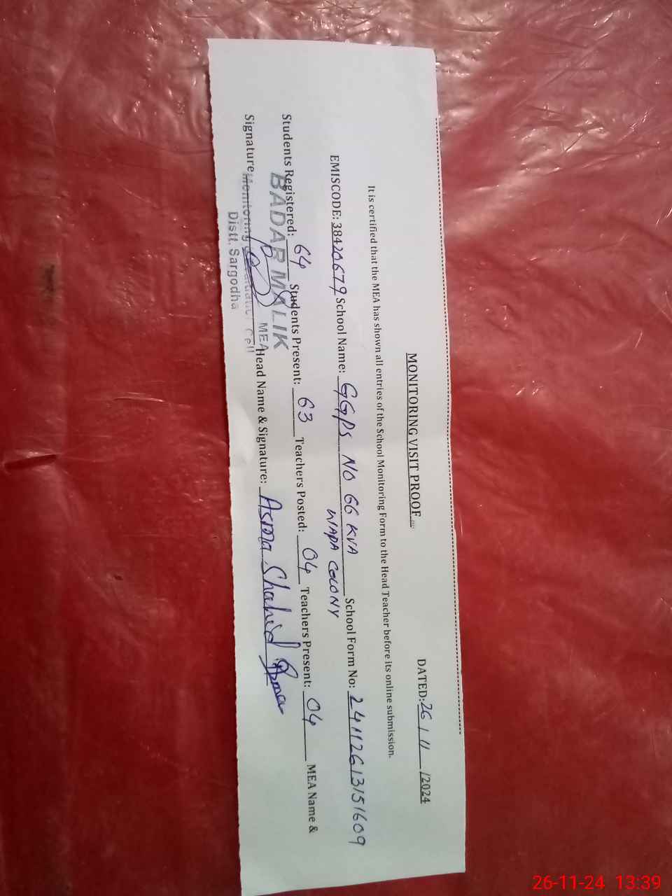 | Certified that this School was Inspected by the Undersigned MEA/DMO Today and the Information Stated Above is as Per Record. | |||||