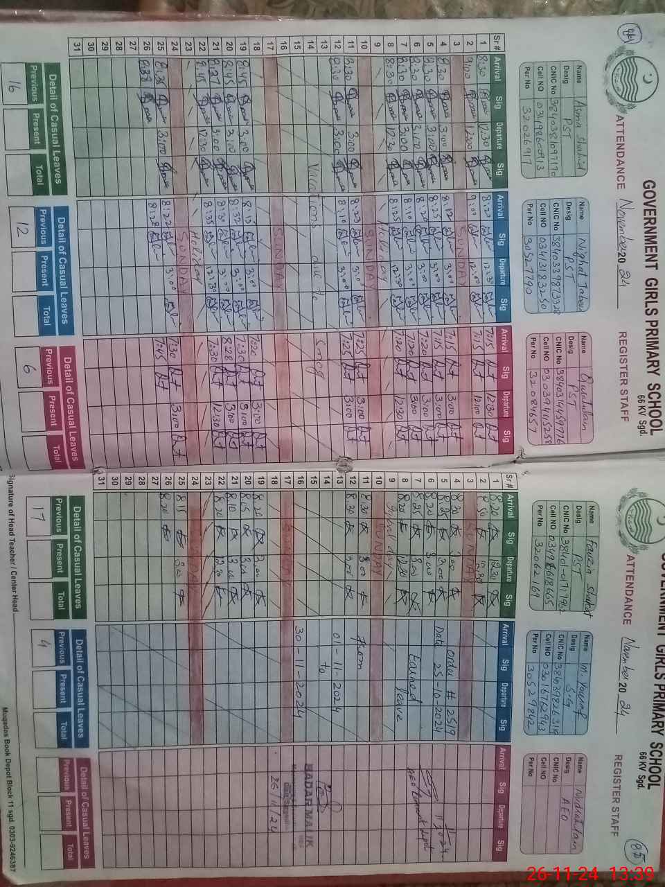 | CNIC | Full Name | Designation | R/C | Absence during last cal. month |