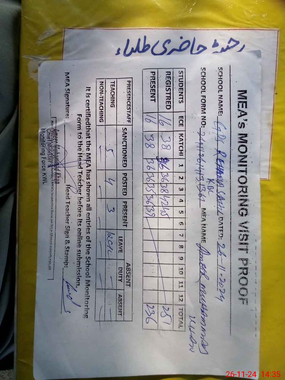 | Attendance Register | Head Teacher | MEA with School | Visit Proof |